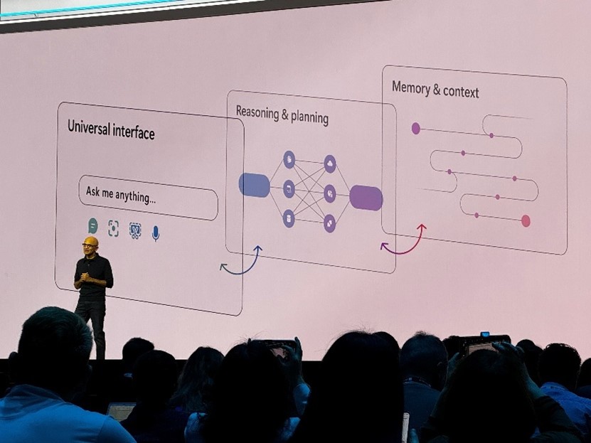 During the Keynote Satya Nadella discussed AI’s capability as a Universal interface: Allowing AI to accept and process various types of input, including speech, images, and videos. Enabling more natural and intuitive interactions between humans and AI systems. Courtesy of the speed of processing (which was also touched upon in Scaling Laws) he showed first-hand how you could query data live, leveraging AI, stepping through reasoning and planning, as well as memory and context, to summarize key trends from the source information being discussed and presented. The input combined visual and audio inputs thus generating human accessible outputs – visualisations with trend data. This was, indeed, impressive!